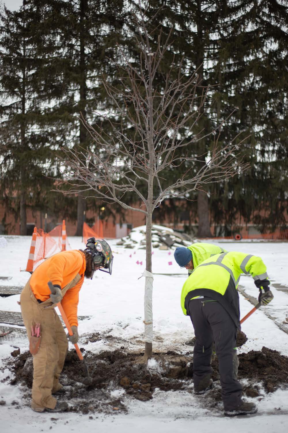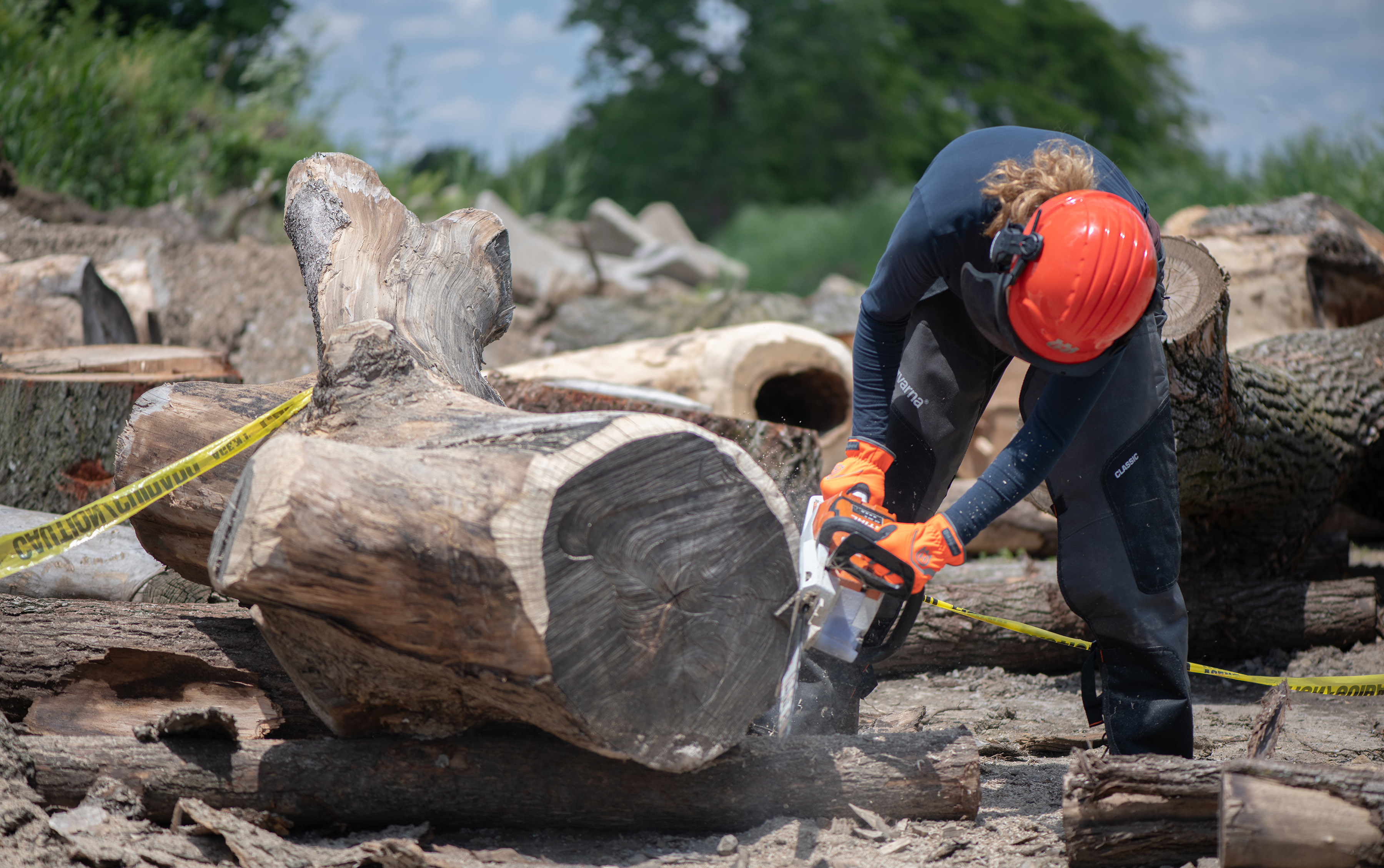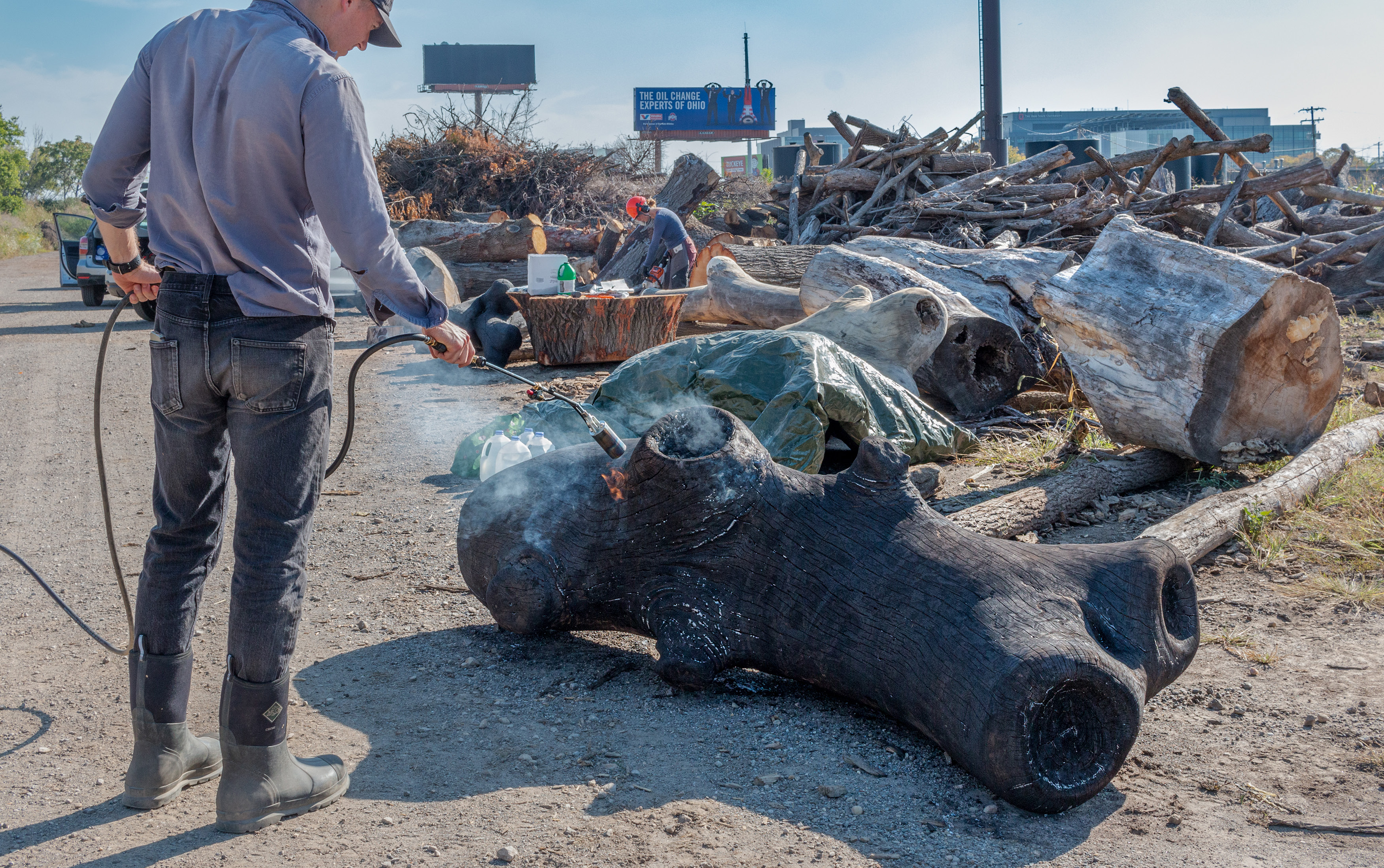 The project brought together partners from across the university to help turn the idea into reality. Aaron Rumbaugh, university landscape architect for Planning, Architecture and Real Estate (PARE), helped connect the many teams involved. “I was mostly helping pull all the necessary parties together. The medical center for approval of the site, IPPLG for funding and FOD for construction, and I acted as the PARE representative for general campus appropriateness,” said Rumbaugh. He said the project stands out because of its creative design and collaboration. “The way Parker and Katie used materials and planting to revitalize a forgotten site made the project a unique one on campus,” said Rumbaugh. “This was an asphalt pad with nothing that made people want to interact. Now the space is more welcoming with furniture, planting and tree and shade cover.” The FOD arborist team also played a key role in the project, helping Sutton and Jenkins set up an outdoor workshop at the campus log pile where the charred wood seating was fabricated and assisting with the careful placement of the large logs at the site.