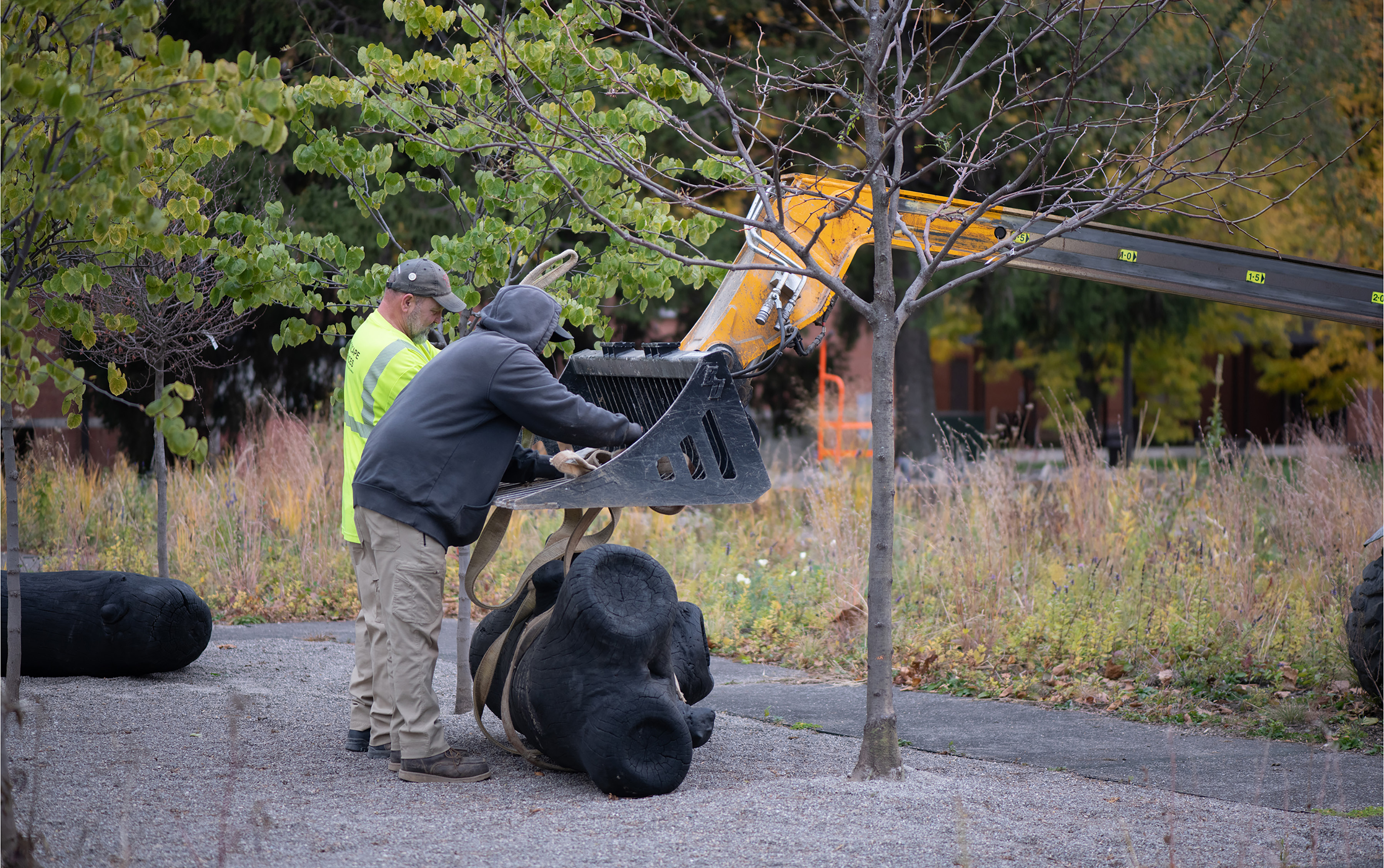 Work began in November 2024 when Facilities Operations and Development (FOD) crews completed the first round of asphalt excavation. Initial seeding and planting followed immediately through November and December. In January 2025, trees were planted throughout the site, also by FOD. By spring, more than 2,000 plant and grass plugs were installed with the help of student volunteers. Sutton and Jenkins spent the summer watering and weeding the prairie while continuing work on the site’s unique features. “When I wasn’t tending to the site, I was fabricating the large, charred logs functioning as site furniture,” said Sutton. The logs, created from fallen campus trees, now serve as seating throughout the space. Last fall, the team also installed two Corten steel planters filled with reclaimed asphalt to create experimental “dry” asphalt gardens. This coming spring and summer, FOD will complete pathways that connect the prairie to nearby sidewalks, improving accessibility and encouraging visitors to explore the space.